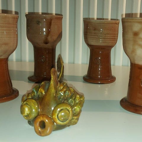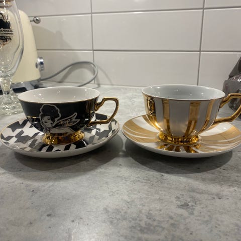13 st. Kaffekoppar med assietter, socker- och gräddkanna på fat, 3 vaser, 2 blomkrukor, terrin, kakfat, 3 uppläggningsfat, 2 äggkoppar, 2 ljusstakar etc. Totalt 63 delar.