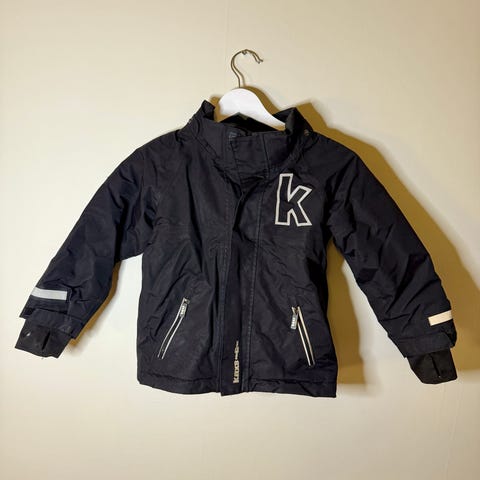 Fodrad svart vinterjacka med fuskpäls på luvan, från Kaxs. Stl 98.