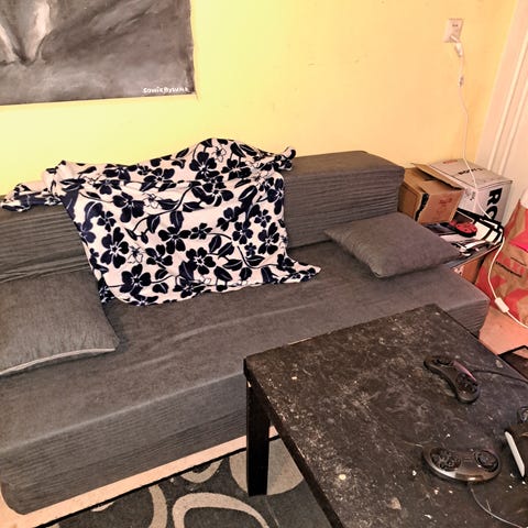 Blå dansk bäddsoffa likt Futon i konstruktion. Knappt använd.