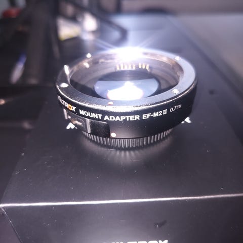 Adapter för Canon EF/EF-S-objektiv till Micro Four Thirds (MFT). 0.71x-booster ger större bildvinkel och ca 1 bländarsteg extra ljus.