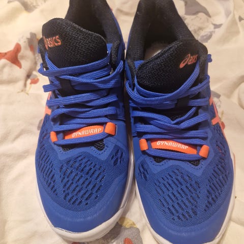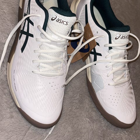 Asics Träningsskor i storlek 39,5. Skorna är vita med lila detaljer och är avsedda för träning. Materialet är ventilerande för komfort under fysisk aktivitet.