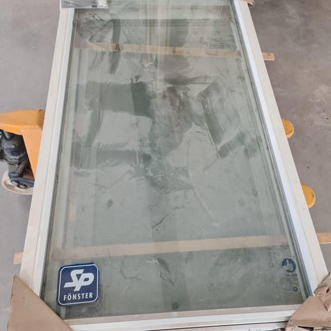 Kvarts format fönster med måtten 595x595 mm tillverkat i trä. Målat med ockragul utsida och svagt ljusgrå insida, 1 st spröjs fönstret är monterat i en träkonstruktion för skydd under transport och hantering. Säljes pga felköp.