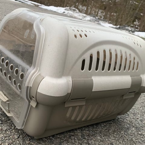 Bärhandtag saknas men går att bära utan problem. Två skruv saknas att hålla ihop över och underdel. Det märks dock inte när man hanterar buren. Går att sätta dit egen skruv om man vill. Buren är begagnad men i fullt funktionellt skick. Dörren öppnar och stänger utan problem.