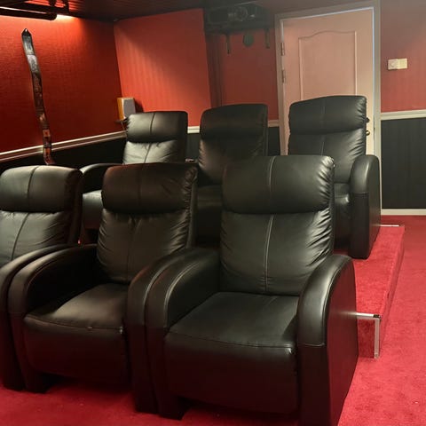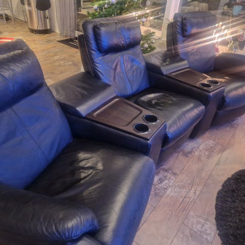 Stiliga och bekväma biostolar i svart skinnimitation, perfekta för hemmabion. Stolarna kan fällas bak för benstöd. Perfekt för en avslappnad filmkväll!
