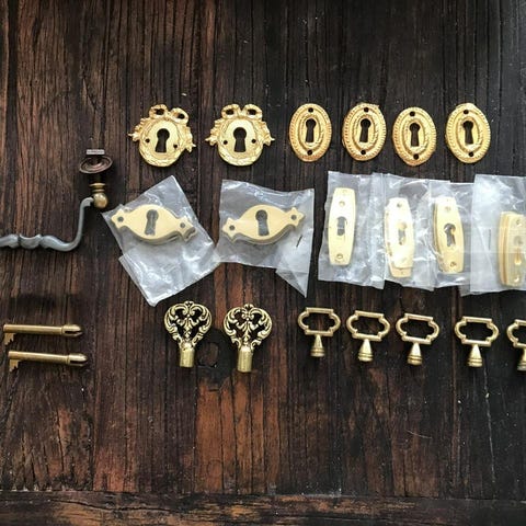 Set med 4 stycken skruvbeslag i mässing till trappledstång. ( kostar 80kr styck nya)