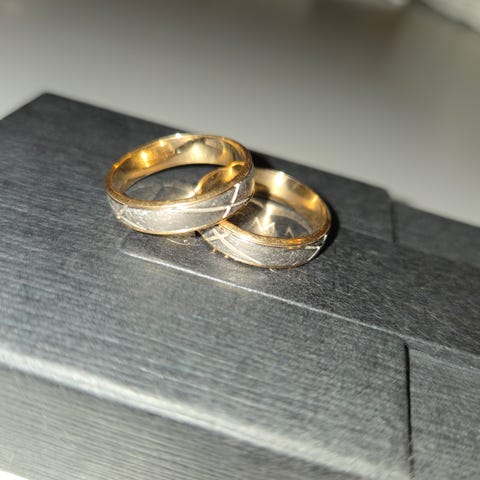Vackert designade smidda vigselringar i 14 karat vitguld i storlek 17 & 20 dessa är oanvända med en gravering i som de på guldsmedsaffärer graverar om för några 100 lappar med puts & de blir som nya