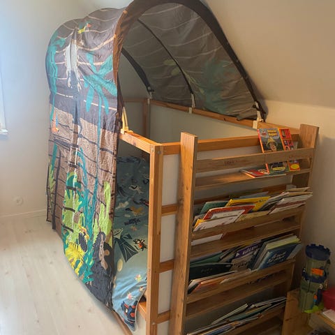 När du har den som hög säng så kan du ha en lekhörna med plats för bus och mys eller en extra sovplats.
