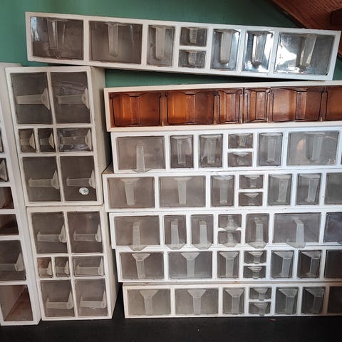Själva hyllan är inte original. Glasen står det Ideal i botten. Locken till burkarna saknas men kan nog ersättas med andra lock.