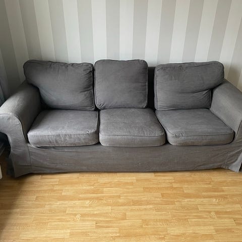 Stor djup skön kvalitetssoffa. Var väldigt dyr när den köptes ny på Stalands. Lite slitet tyg kan behöva fixas, skada syns på bild. Vi har haft filtar över. Bortskänkes pga ombyggnad.