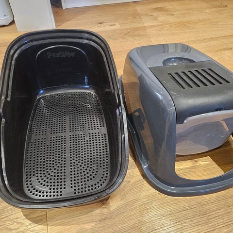 PeeWee EcoDome kattlåda för pellets i grå plast med måtten 66x45x38cm, storleken är lämplig för större katter eller om man har flera katter i hemmet.
