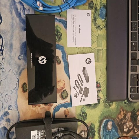 HP Dockningsstation för datorer med flera anslutningsmöjligheter inklusive VGA, Ethernet, HDMI och strömadapter. Anslutningsenhet avsedd för att utöka datorns funktionalitet och möjliggöra anslutning till externa enheter och nätverk.