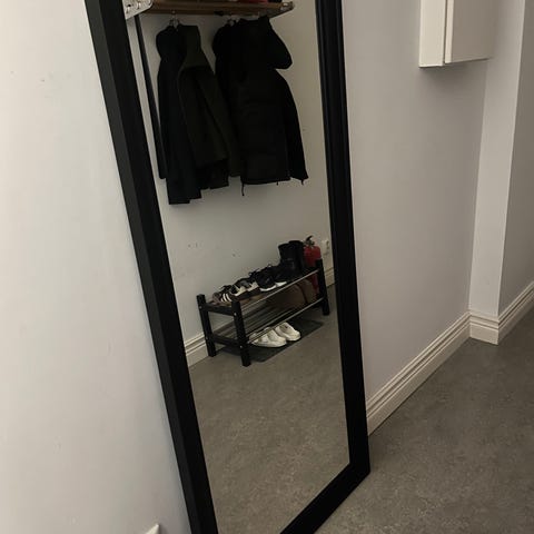 IKEA spegel med svart ram. Spegeln är rektangulär och har en enkel design med en svart ram som omger spegelglaset. Passar för väggmontering och kan användas i olika rum för att reflektera ljus och ge en känsla av rymd. Den kan också placeras direkt på golvet. Total höjd är 177 cm och total bredd är 72 cm. Själva ramen runt om är 9 cm.
