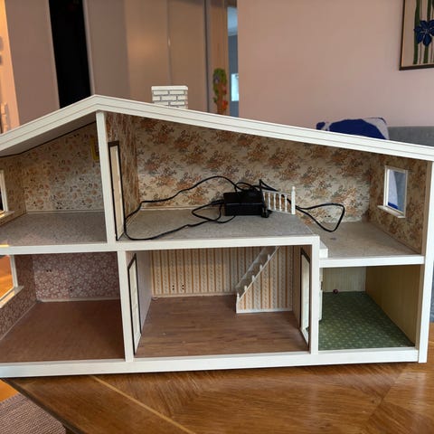 Dockhus i trä med två våningar och möblerat inredning