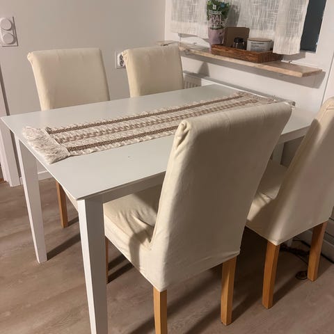 Matbord med vit/björkfanervit yta.