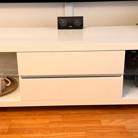Snygg och modern mediamöbel i vit högglans med väggskåp, vitrindel, vägghylla och TV-bänk. Mycket bra skick och gott om förvaring. Passar perfekt i vardagsrum för en ren och modern look. (Säljs exklusive Teven!!)
