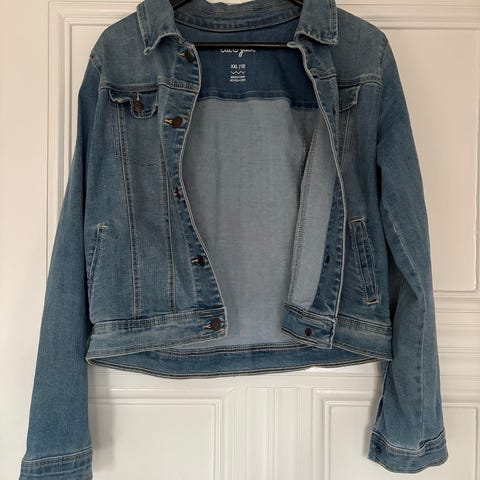 Säljer en jeansjacka i off-white denim med ikoniska guldbroderade änglavingar på ryggen, guldfärgade knappar och flera dekorfickor framtill. Lite stretch i tyget (97% bomull / 3% lycra) gör den både bekväm och snygg i passformen.