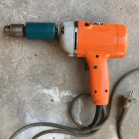 Okänd slagborrmaskin med tillbehör inklusive klämmor och en bärväska. Maskinen är orange och drivs med elkabel. Levereras i en grå plastväska för förvaring och transport.