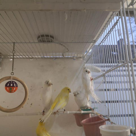 Jag har en grupp fåglar till salu. Alla fåglar är friska och cirka 10 månader gamla. Det finns 13 stycken, och priset är 1300 kr. Det ingår några leksaker och bon, som du får gratis vid köp av fåglarna.
