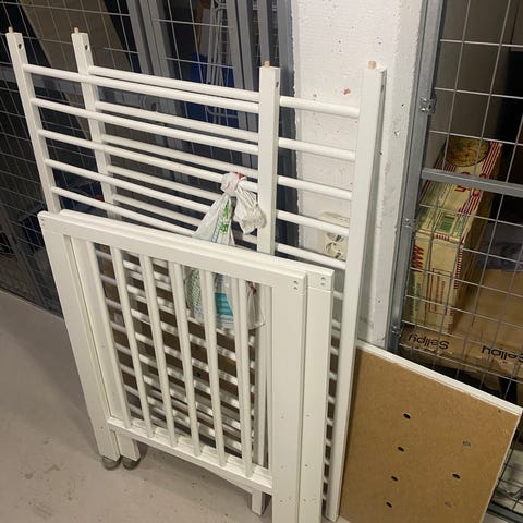 IKEA Spjälsäng i vitt, designad för småbarn. Sängen är tillverkad i trä och har spjälor runtom för säkerhet. Passar för barn och är avsedd för inomhusbruk som barnsäng.