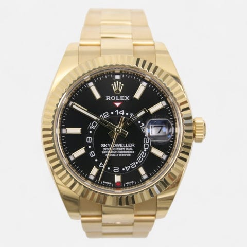 Vi säljer en mycket fin Rolex Sky-Dweller som är tillverkad i 18k Gulguld.