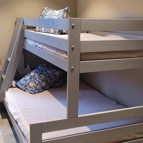Familiekøyeseng med to Nirva Ekornes skumgummimadrasser med avtagbare trekk. Medium fasthet vil jeg si at de er. Stått på gjesterom. I god stand. Selges grunnet overgang til annen seng. Kan males om annen farge ønskes.