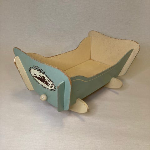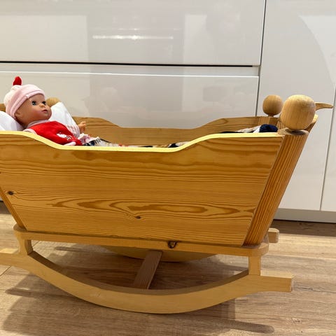 Robust trävagga från 1976 eller 1978 har använts som dockvagga. Dock är den så bastant och välgjord att det skulle gå att sova i. Det står Linda på ena sidan och 1974 på den andra, men kan enkelt döljas med t.ex passande klistermärken.