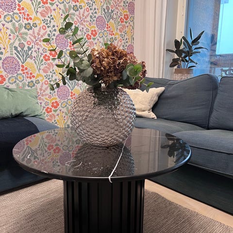 Runt soffbord med marmorliknande skiva och metallben