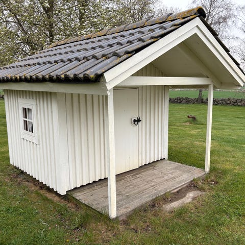 Lekstuga i trä med röd och vit färg, blå dörr och medföljande leksakskök i rosa och blå färg. Stugan är lämplig för barn och har en liten inhägnad fram. Kökets funktioner inkluderar spis, ugn, mikrovågsugn och kylskåp med detaljerade handtag och knappar.