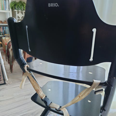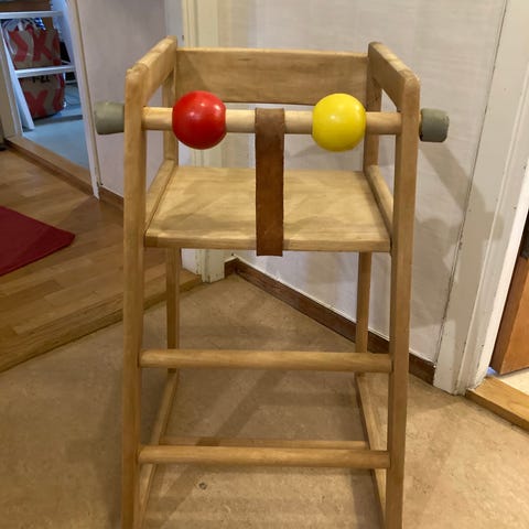 BRIO Barnstolar Barnstol i trä med grön färg. Utrustad med röda och gula kulor som detaljer. Passar för barn och är utformad för att ge stöd och säkerhet under sittning. Har naturligt sätt skavanker då det är retro/vintage.