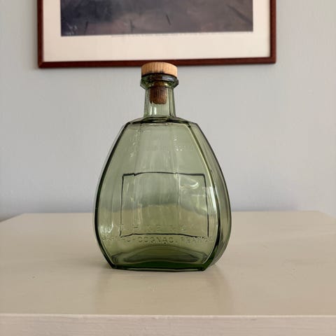 Grön flaska med kork, 28 cm hög. Finns att hämta i Hässelby villastad. Se gärna övriga annonser.