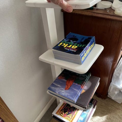 Vägghylla. Hyllplanen är böcker i stället för träskivor. Hyllan är tvådelad. Skruvas fast i väggen. Köp en för golv till tak eller två bredvid varandra. Annorlunda.