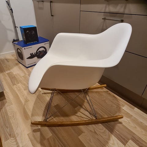 Lättplacerad amerikansk gungstol i mörkt trä med fotpall, klädsel beige mönstrat siden. Mått: Höjd 120 cm, inkl ryggstöd, bredd 55 cm, djup 55 cm. Fotpallen är 45x45 cm, höjd 30 cm. Utmärkt skick.