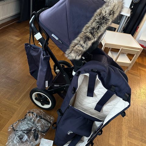 Bugaboo Cameleon 3, sittdel, liggdel, regnskydd, extra hjul för vintern, förlängningsbar sufflett. Solblekt sufflett, alla delar i tyg går att köpa och byta ut i andra färger om man vill det. Använd av ett barn, inköpt på babyproffsen för 12000, följer även med bugaboo mini skötväska man kan hänga på handtaget eller på sidan av vagnen. Allt för 1500kr. Finns i Robertsfors.