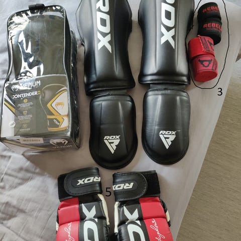Säljer nu min kampsportsutrustning pga flytt, grejerna är använda några gånger men inga synliga skador och funkar som nya. Finns också ett par MMA handskar, skriv för bild.