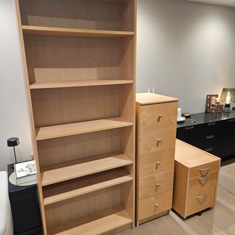 Bokhylla inkl hurtsar i fyra sektioner samt skrivbord med hörntillsats för dator