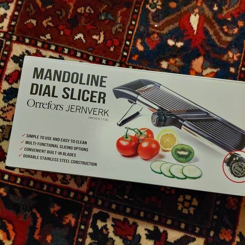 Praktisk multifunktionell mandolin/grönsaksskärare med flera utbytbara blad. Perfekt för snabb matlagning och jämna bitar!