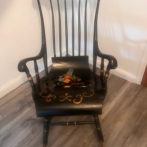 Trästol med ryggstöd och spjälor i mörkbrun finish. Stolen har en rundad sits och ben med stag och fint svarvade former.