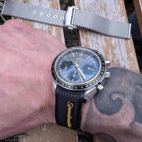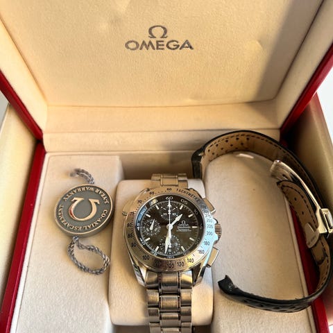 Säljer en smått legendarisk klocka som Omega gjorde tillsammans med Michael Schumacher på 90-talet när "Schumi" körde för Ferarri, den än idag mest framgångsrika eran av en F1-förare. Det är i grunden en automatisk 39mm Speedmaster som storleksmässigt ligger helt rätt i tiden. Den röda färgen har framtagen i samråd med Ferarri och ska vara samma som deras "Rosso Corsa" som de oftast använder på sina racingbilar men även går att få sin gatlegala Ferarri i.