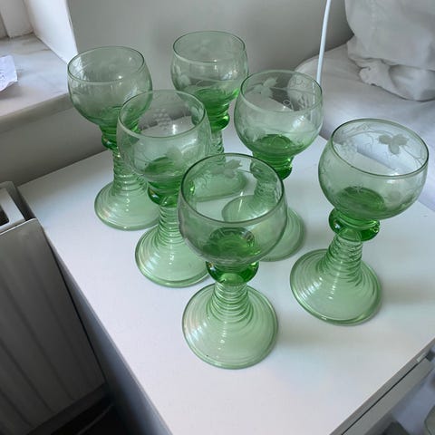 Fyra fina remmare med grön kupa och fot i klarglas, höjd ca 19 cm. Svarvad fot och kupa med graverad dekor av vinrankor.