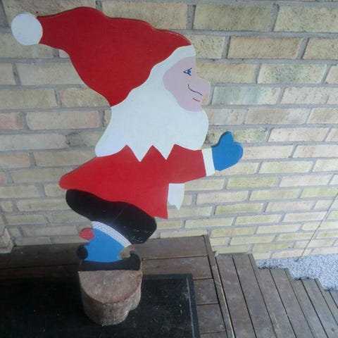 23 cm hög jultomte på skidor och med presentsäck på ryggen.