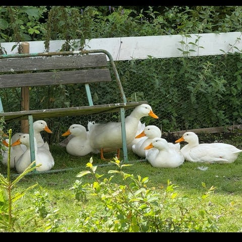En grupp Pekingankor på 6 individer, 8 veckor gamla.