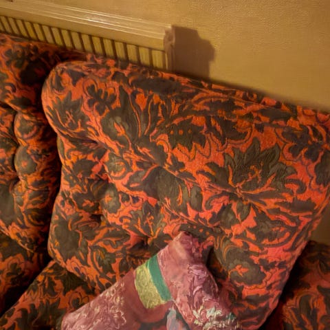 Ett armstöd har en lagning och lite kattklös på någon sida av fåtöljerna