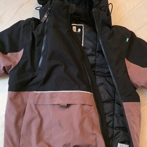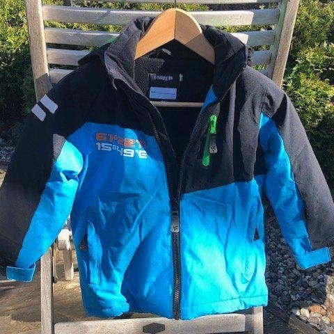 Jackan har en blå färg med dragkedja fram, huva och justerbara ärmslut med kardborreband. Designad för att ge skydd och komfort vid utomhusaktiviteter.