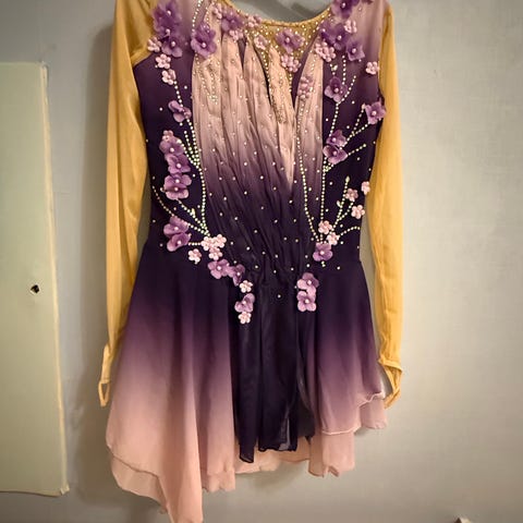 Konståkningsklänning i rött med långärmade ärmar och öppen rygg med korslagda band. Klänningen har dekorativa detaljer framtill och en kjol med lätt volang.