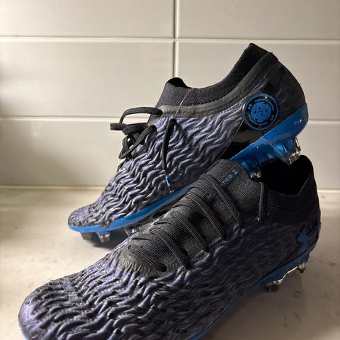 Umbro Tocco IV Pro FG fotbollsskor i storlek 43. Skorna är vita med röda och blå detaljer. De är tillverkade för gräsunderlag med FG (firm ground) dobbar. Modellen är designad för att ge bra grepp och kontroll på planen.