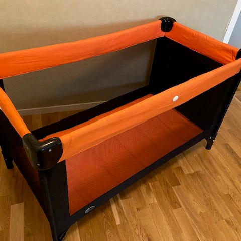Resesäng i svart färg. Bärbar och hopfällbar modell med medföljande förvaringsväska. Passar för barn och är tillverkad i lätt material för enkel transport och förvaring.