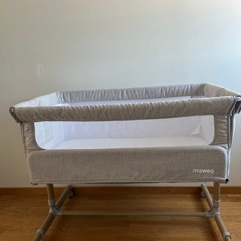 Moweo Bedside Crib i grå färg. Säng för barn med sidomontering som möjliggör enkel åtkomst till barnet. Tillverkad i material som ger stabilitet och säkerhet. Passar för små barn och kan användas som en extra sovplats nära föräldrasängen.