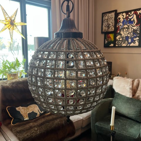 Vacker klotformad taklampa i metall och små kristaller från MIO. Passar i både hall, sovrum som i vardagsrum. Nypris 2995 kr.