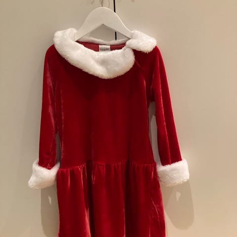 KappAhl Sammet Klänning i röd färg, storlek 104 för flicka. Tillverkad i sammet, klänningen har en mjuk och glansig yta. Den har lång ärm och knäppning vid axeln för enklare på- och avklädning.