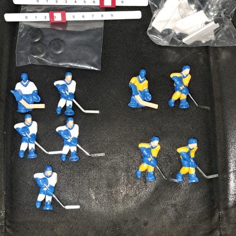 Säljer bara benen till ett hockeyspel från Stiga. Notera att det är bara benen, inte de två plastdelarna som ska hålla ihop benen.
